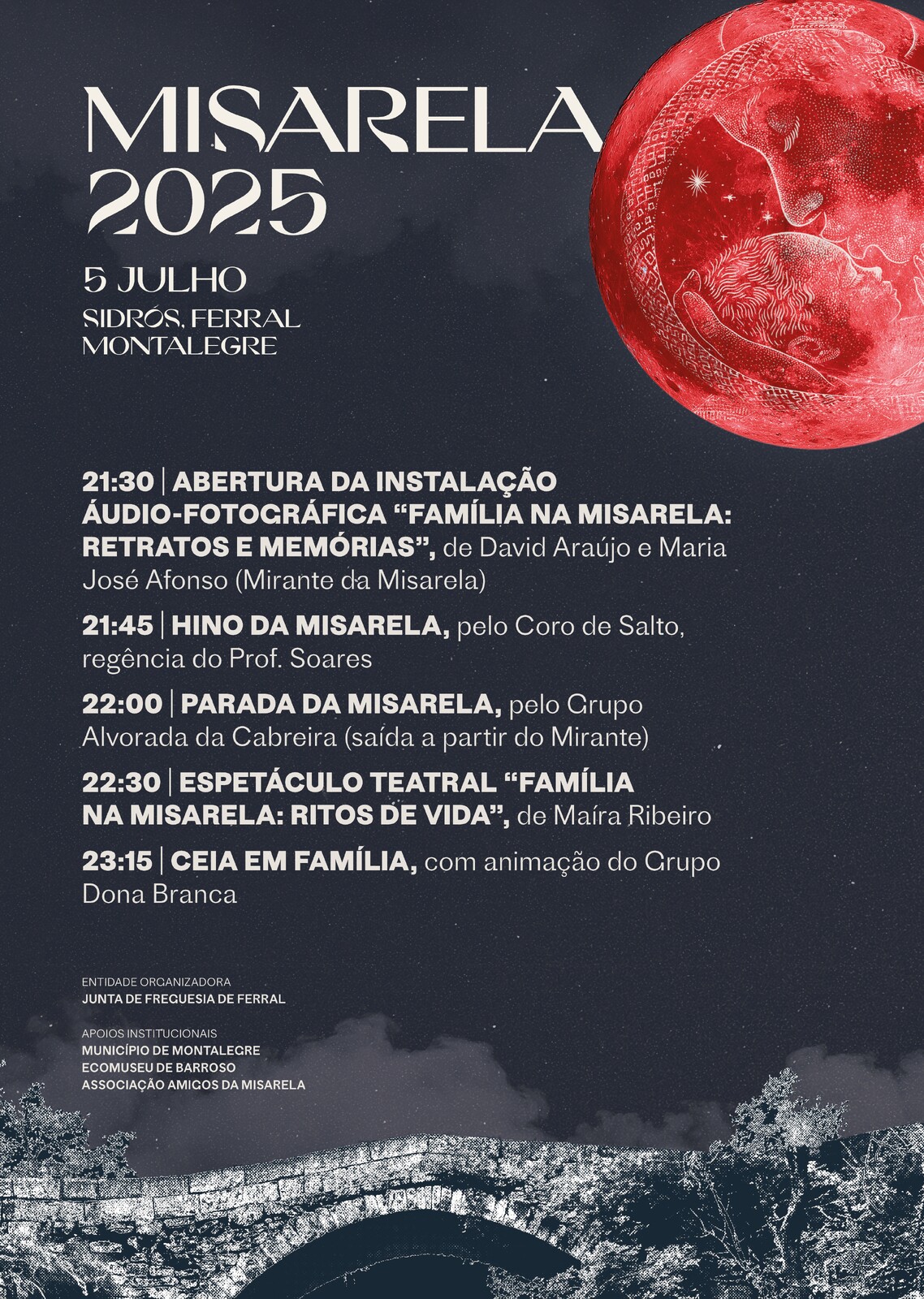 A aldeia de Sidrós, freguesia de Ferral, concelho de Montalegre, celebra no primeiro sábado de julho mais uma festa da "Ponte da Misarela". Nesta edição o espetáculo intitulado “Família na Misarela: Ritos de Vida” é uma criação sensorial e simbólica que entrelaça mitos, memórias e histórias verídicas de gerações marcadas por rituais de fé, fertilidade e resistência. Um cartaz cultural - apoiado pelo Município de Montalegre - que promete voltar a reunir centenas de curiosos num dos locais mais encantadores do nosso território.