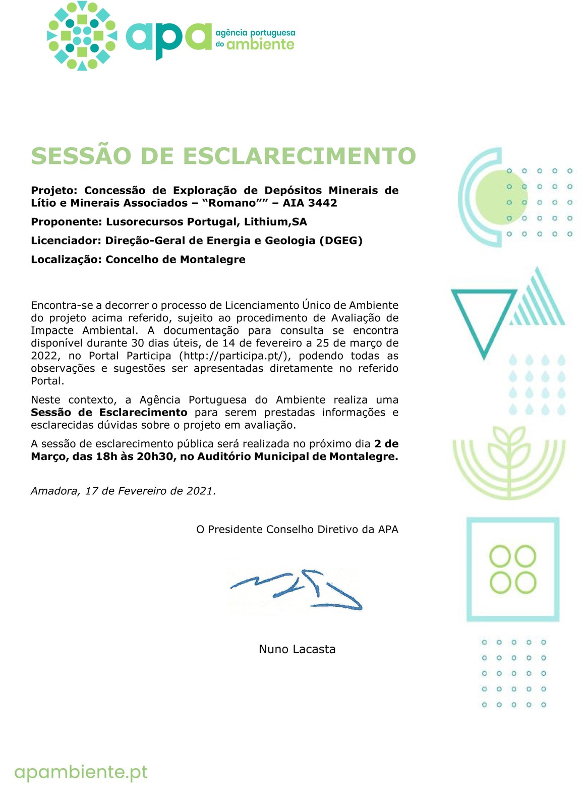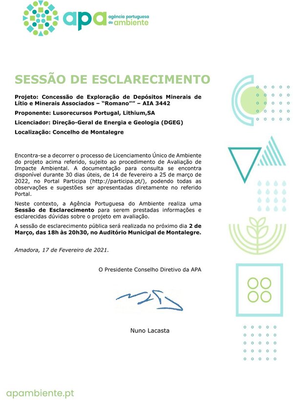 A Agência Portuguesa do Ambiente (APA) realiza uma sessão de esclarecimento no próximo dia 2 de março, pelas 18 horas, no auditório municipal de Montalegre, no âmbito do projeto - Concessão de Exploração de Depósitos Minerais de Lítio e Minerais Associados – "Romano" – AIA 3442. Recorde-se que o processo de Licenciamento Único de Ambiente deste projeto está sujeito ao procedimento de Avaliação de Impacte Ambiental. A documentação para consulta está disponível - desde o passado 14 de fevereiro até 25 de março - no Portal Participa, podendo todas as observações e sugestões ser apresentadas diretamente no referido Portal.