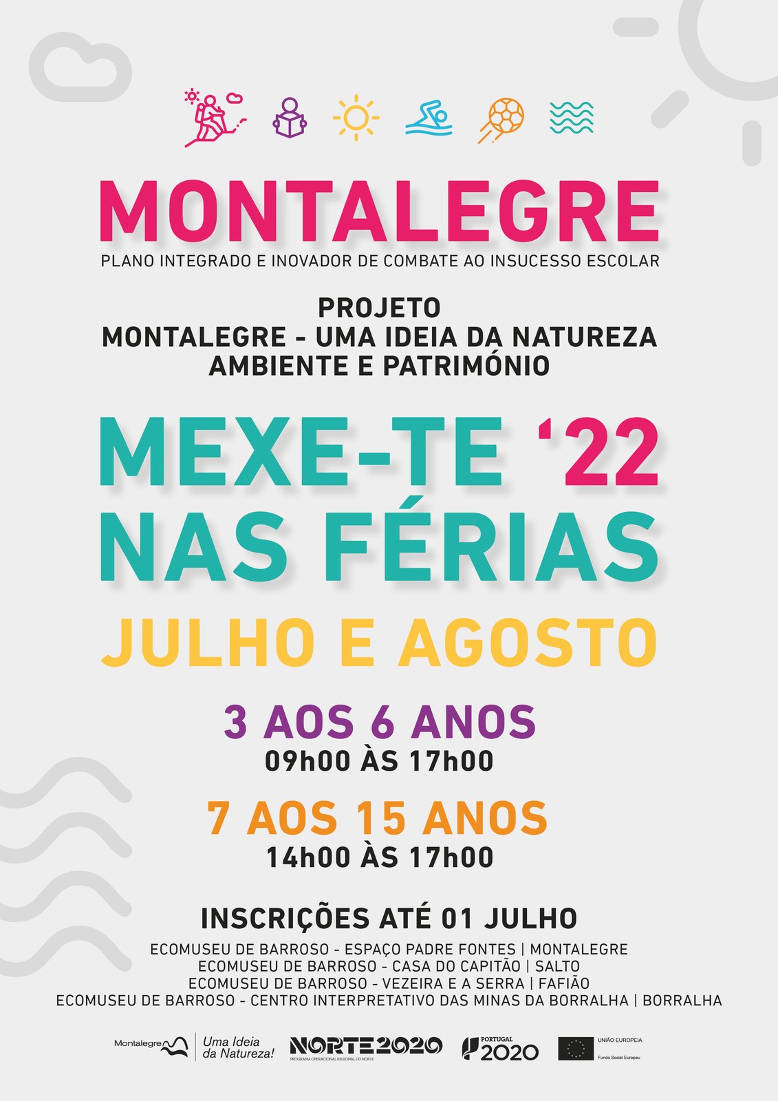 Está de regresso o projeto "Mexe-te nas Férias", este ano com o atrativo de também apresentar atividades dirigidas a crianças dos 3 aos 6 anos. As inscrições estão abertas (até 1 julho) para uma iniciativa que irá percorrer os meses de julho e agosto. O programa "Mexe-te nas Férias" está integrado numa atividade denominada "Montalegre, uma ideia da Natureza – Ambiente e Património" que, por sua vez, integra o Plano Integrado e Inovador de Combate ao Insucesso Escolar (PIICIE) promovido pelo município de Montalegre. Esta atividade tem como parceiros o Ecomuseu de Barroso, as Juntas de Freguesia de Salto e Cabril e tem como objetivo principal a inclusão educativa e social das crianças e jovens, potenciando o sucesso escolar através das aprendizagens informais, do reforço das literacias básicas e valorização cultural das crianças e jovens. Neste sentido, o PIICIE é financiado pelo Portugal 2020, através do PO Norte, e pela União Europeia, através do Fundo Social Europeu (FSE).