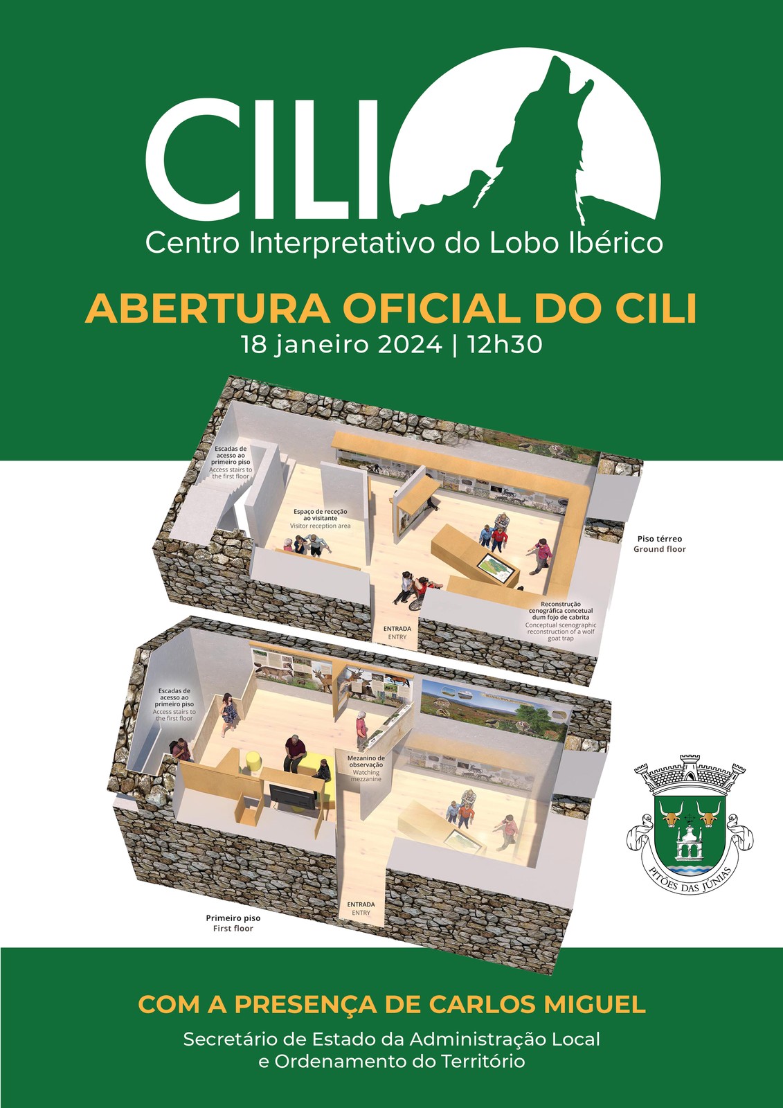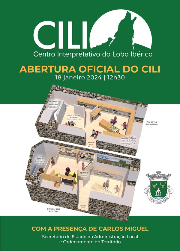 Esta quinta-feira, às 12h30, em Pitões das Júnias, tem lugar a abertura oficial do Centro Interpretativo do Lobo Ibérico (CILI). Criado na turística aldeia de Pitões das Júnias, estamos perante um espaço todo ele dedicado ao lobo, onde a própria arquitetura do seu interior projeta o visitante nas várias tipologias de fojos de lobo existentes na região do Barroso e nele se conseguiu apresentar uma imagem completa do lobo-ibérico (Canis lupus signatus) nas suas múltiplas perspetivas e contextos, como espécie selvagem, como parte integrante duma paisagem e como parte duma relação com o Homem, no passado e no presente. Trata-se do primeiro centro interpretativo do lobo-ibérico em Portugal focado nas populações selvagens deste predador e na história das suas relações com o Homem, localizado em plena área de ocorrência desta espécie. A abertura conta com a presença, entre outras individualidades, do Secretário de Estado da Administração Local e Ordenamento do Território, Carlos Miguel.