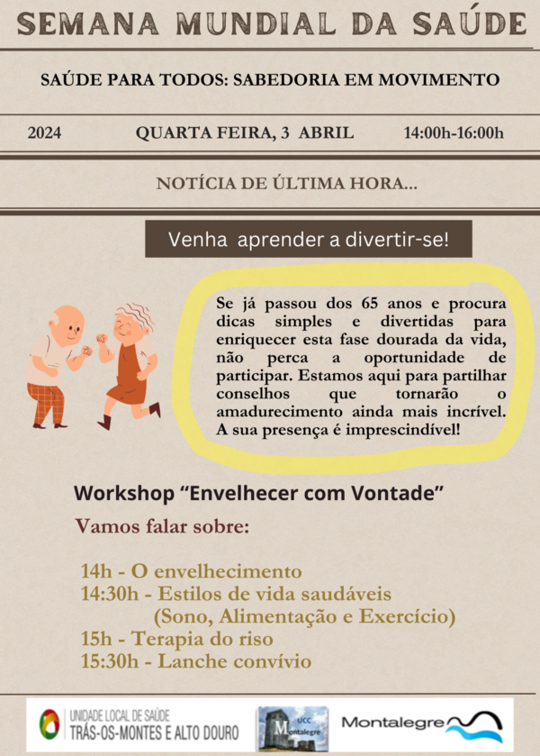 A Unidade Cuidados na Comunidade (UCC) de Montalegre, com a parceria da Câmara Municipal de Montalegre, promove dia 3 de abril, a partir das 14 horas, no Auditório Municipal, um workshop sob o lema "Envelhecer com Vontade". Esta iniciativa, está enquadrada na "Semana Mundial da Saúde".