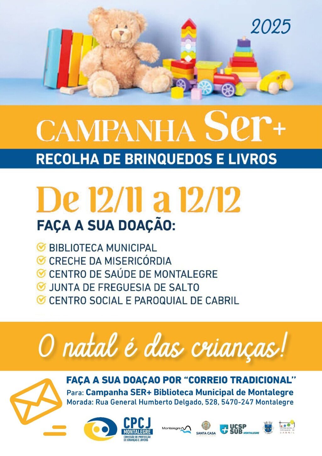 Está no terreno, até 12 de dezembro, mais uma edição da campanha solidária "SER+", iniciativa levada a cabo pela CPCJ Montalegre. Uma ação - visa recolher livros e brinquedos para presentear as crianças e jovens mais desfavorecidos do concelho - que engloba a colaboração do Município de Montalegre (através da Biblioteca Municipal de Montalegre), Creche da Santa Casa da Misericórdia de Montalegre, Centro Social e Paroquial de Cabril, Centro de Saúde de Montalegre e Junta de Freguesia de Salto. Os donativos podem ainda ser enviados pelo correio.