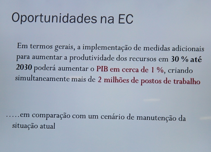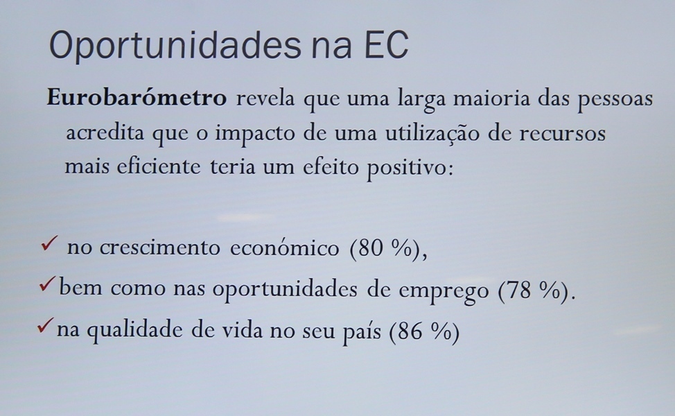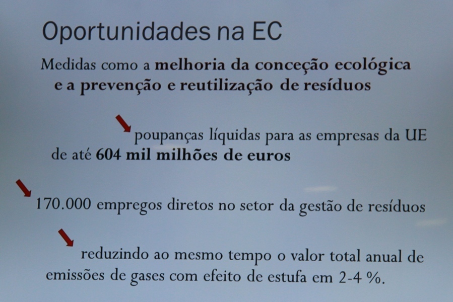 Todavia, executado o modelo, há oportunidades como a reutilização dos resíduos que podem gerar uma poupança líquida para a União Europeia até 604 mil milhões de euros; 170.000 empregos diretos no setor da gestão de resíduos e redução de emissão de gases com efeito estufa em 2,4%. Foi também explicado que se aplicarmos medidas direcionadas à economia circular e se aumentarmos a produtividade dos recursos em 30%, aumenta-se o PIB em 1% e criam-se cerca de dois milhões de postos de trabalho. Para tal, importa reutilizar, se não for possível reutilizar, reciclar e reparar.