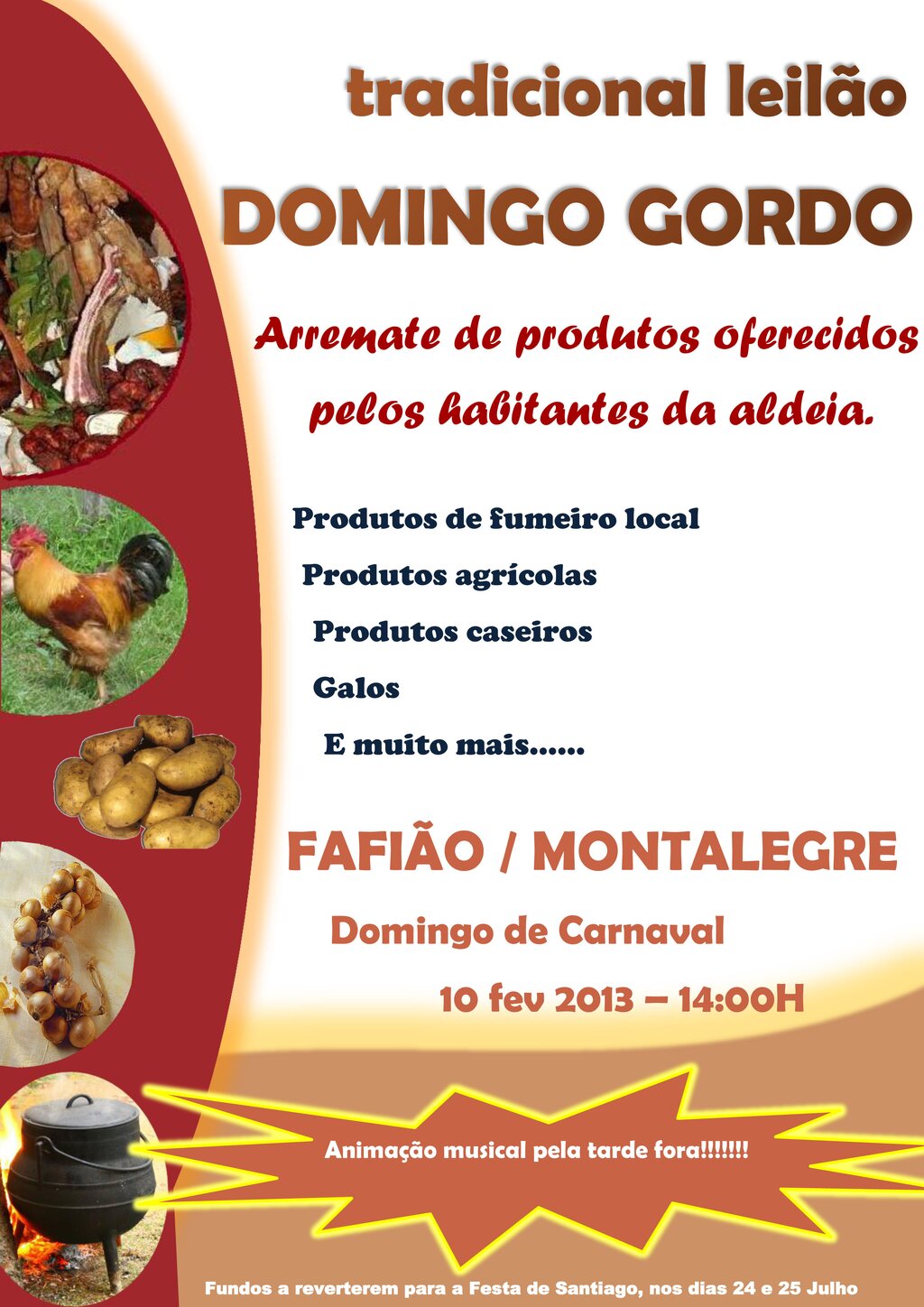 Tendo por fim cumprir uma tradição de largos anos, a comissão de festas de São Tiago realiza no próximo domingo, pelas 14 horas, o tradicional leilão de "Domingo Gordo", no intuito de angariar fundos para a festa anual da aldeia de Fafião, freguesia de Cabril, concelho de Montalegre. Trata-se de um leilão/arremate de «produtos locais, fumeiro, produtos agrícolas, galos, entre muito mais, oferecidos pelos habitantes da aldeia para a angariação de fundos», explica Lino Pereira, em nome da organização desta iniciativa.