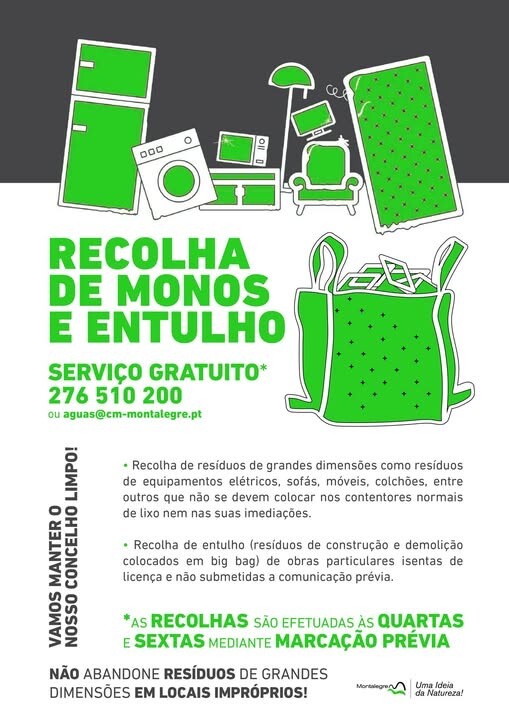 A Câmara Municipal de Montalegre reforçou a divulgação do seu serviço de recolha de "monos" e entulho , uma iniciativa gratuita destinada a auxiliar os munícipes no descarte correto de lixo volumoso. A recolha acontece às quartas e sextas. Desta forma a autarquia visa dar resposta à necessidade de eliminar resíduos que, pelas suas dimensões ou características, não podem ser depositados nos contentores habituais. O serviço abrange a recolha de uma vasta lista de materiais, material elétrico e eletrónico, colchões, móveis, sucatas, pneus e restos de pequenas obras.