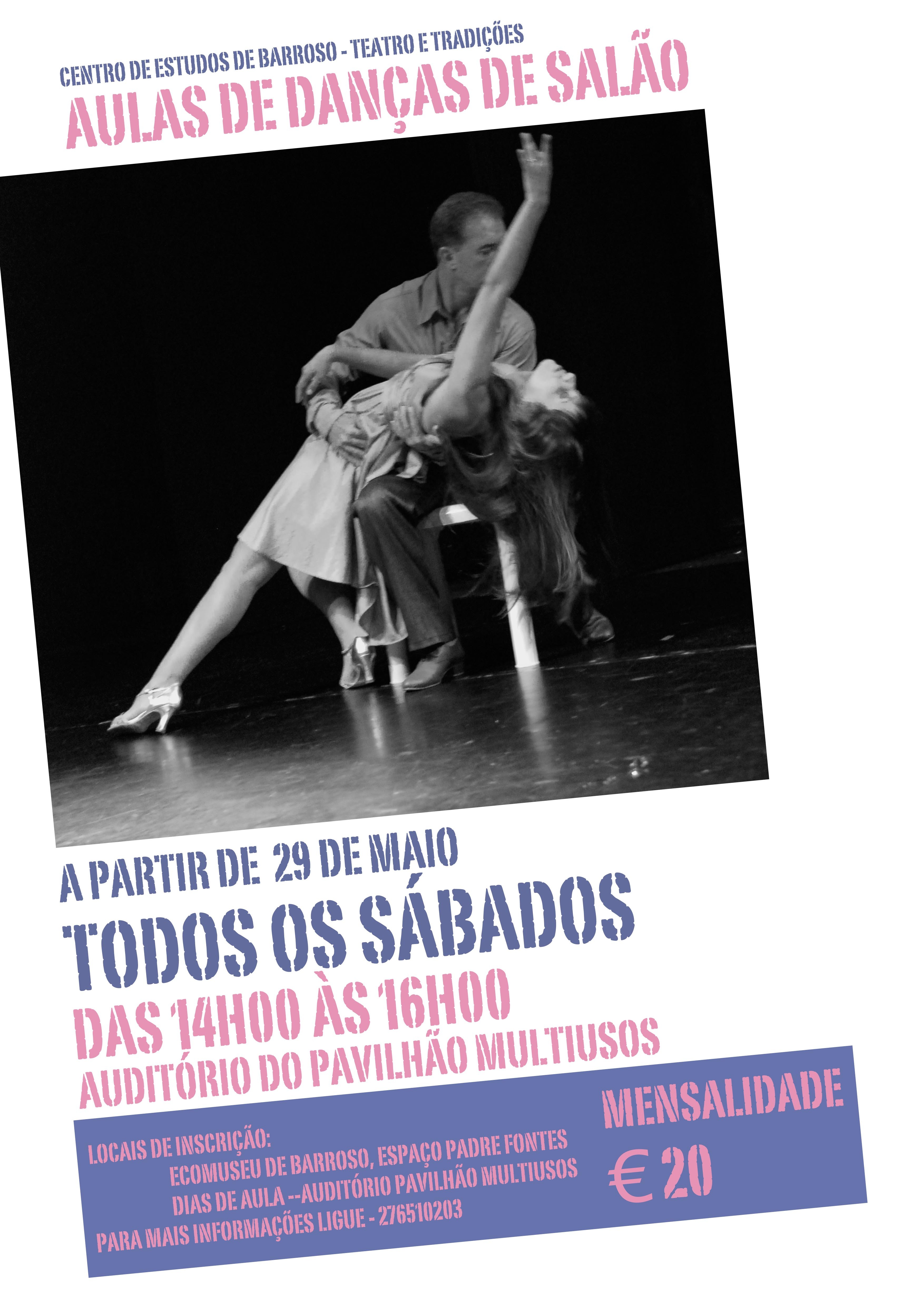 "Oficinas de Dança" em Montalegre. Uma realidade a partir do próximo dia 29 numa iniciativa do Centro de Estudos de Barroso com o apoio do Ecomuseu de Barroso. Depois do êxito do Workshop de Danças de Salão, realizado no passado dia 15 de Maio, a produção do CEB promove uma nova alternativa artística em aulas leccionadas pela professora e bailarina profissional Julia Jueves. Acontecem todos os sábados a partir das 14 horas. Para os interessados, as inscrições serão feitas no Ecomuseu de Barroso – Espaço Padre Fontes ou nas Oficinas de Actor no Pavilhão Multiusos com uma mensalidade de vinte euros.