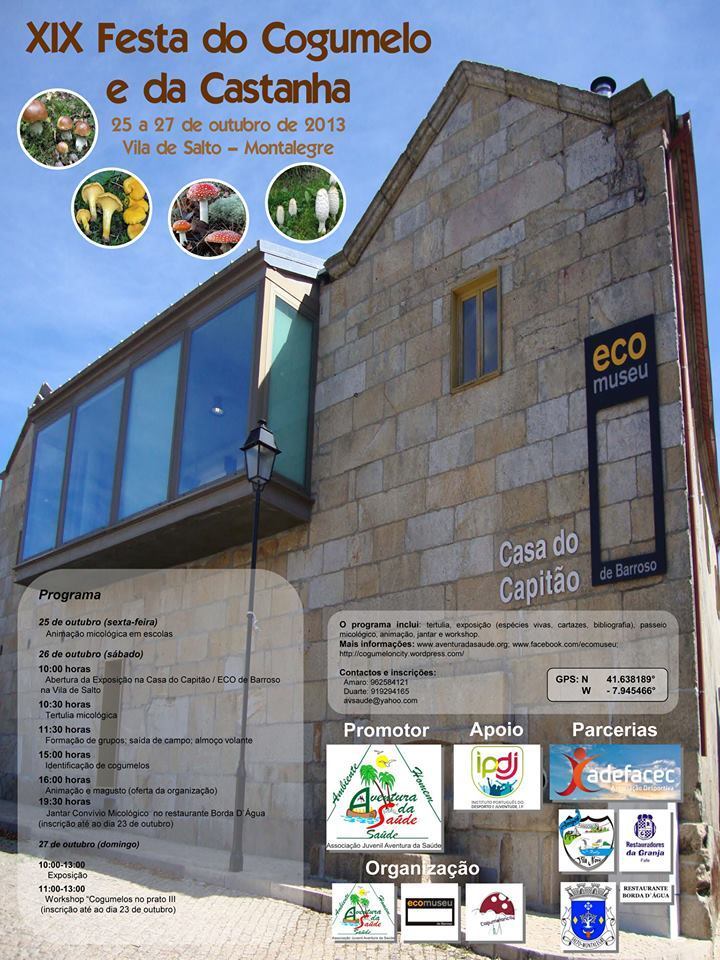 Decorreu na vila de Salto, concelho de Montalegre, a XIX Festa do Cogumelo e da Castanha. A iniciativa, organizada pela associação Aventura da Saúde de Braga em colaboração com o pólo de Salto do Ecomuseu de Barroso – Casa do Capitão, apresentou várias atividades como tertúlia, exposição (espécies vivas, cartazes, bibliografia), passeio micológico, animação, jantar e workshop. Ao todo mais de uma centena de participantes tiveram oportunidade de observar a riqueza extraordinária que pode ser encontrada na natureza do Barroso.