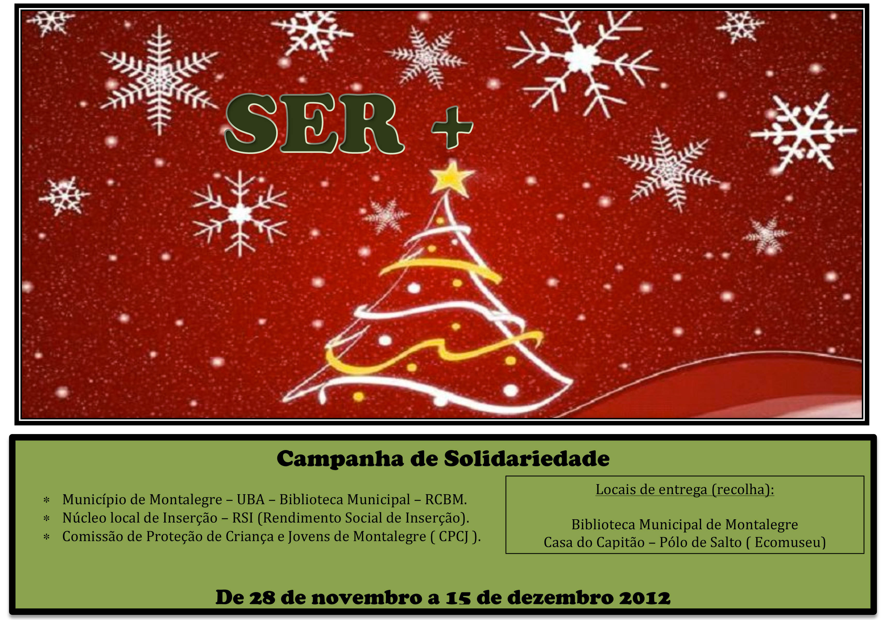 Volta o desafio à população nesta quadra natalícia tal como sucedeu no ano anterior. Falamos da campanha solidária "Ser +" levada a cabo pela Biblioteca Municipal de Montalegre, em conjunto com a Comissão de Proteção de Crianças e Jovens de Montalegre (CPCJ) e com o Núcleo Local de Inserção - RSI (Rendimento Social de Inserção). Até sábado, os interessados podem depositar os donativos nas instalações da Biblioteca Municipal ou na Casa do Capitão (Salto), pólo do Ecomuseu de Barroso.