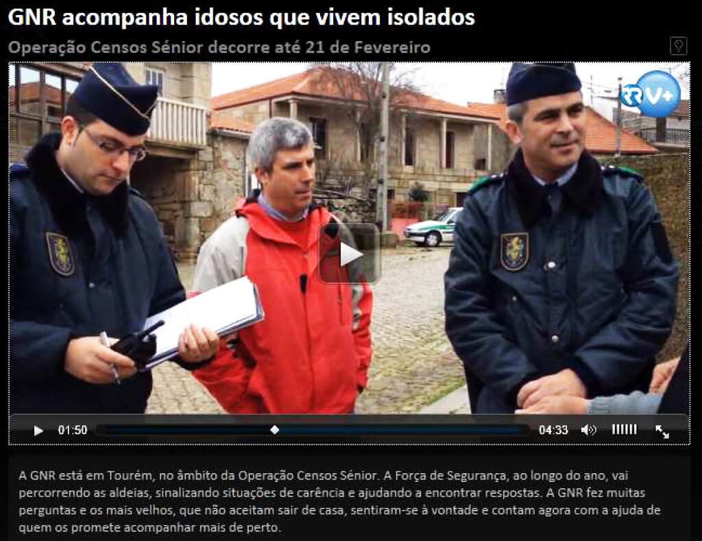 A segunda edição da operação "Censos Sénior" passou, por estes dias, pela freguesia de Tourém, concelho de Montalegre, onde alguns elementos da GNR puderam «atualizar os dados existentes relativamente aos idosos que vivem sozinhos ou isolados». Esta força de segurança adianta que do registo «consta a identificação de cada idoso, idade, contacto e identificação dos familiares mais próximos». Sobre esta notícia, o porta-voz da GNR, tenente-coronel Pedro Costa Lima, garantiu que «os idosos identificados ficam registados e localizados através de GPS pelos militares da GNR, permitindo no futuro, como em situações de catástrofes, saber onde se encontram». Refira-se que no arranque desta operação, esta permitiu identificar 15.596 idosos que vivem sozinhos ou isolados. Segundo os dados enviados à comunicação social, Santarém, Porto, Castelo Branco, Bragança, Braga, Vila Real e Aveiro são os distritos com mais casos, mais de mil em cada um deles. Corvo, nos Açores, é o distrito com menos idosos a viver sozinhos ou isolados, com 14.