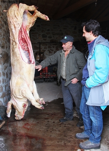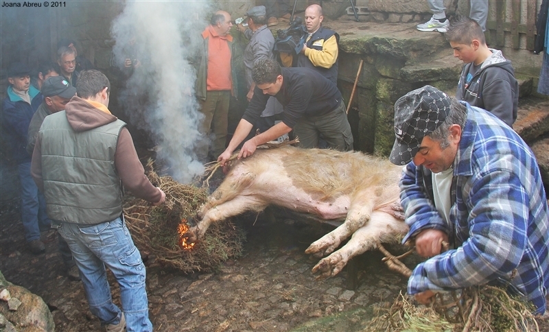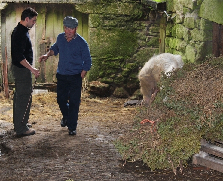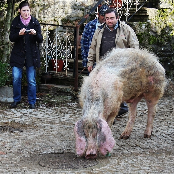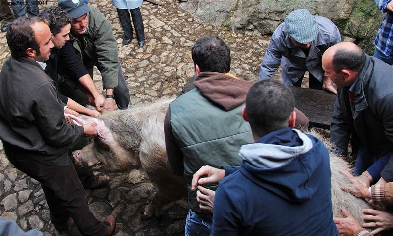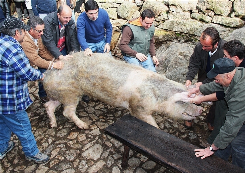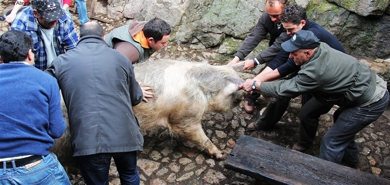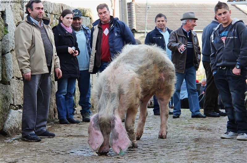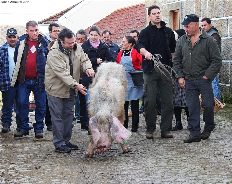 Um porco incomum, no peso e na fisionomia, foi o protagonista da jornada perante os olhares, alguns de espanto, de um cortejo que pisou uma das principais ruas da aldeia. Os curiosos seguiram atrás do animal que, assustado, perdia força nas pernas e não queria continuar. Já na eira, foi travada a luta "homem-porco". Perto de uma dezena de homens conseguiram dominar o animal e foi em clima de espanto e satisfação que todos assistiram ao processo de matança, limpeza e abertura do porco.