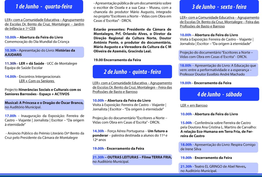 Está aberta até domingo, no pavilhão multiusos de Montalegre, a XVII Feira do Livro, cartaz cultural que apresenta uma oferta variada de cultura com várias palestras e alguns lançamentos de livros. Um evento que assinala o centenário de vida literária de Ferreira de Castro e a invocação da obra do saudoso Bento da Cruz.